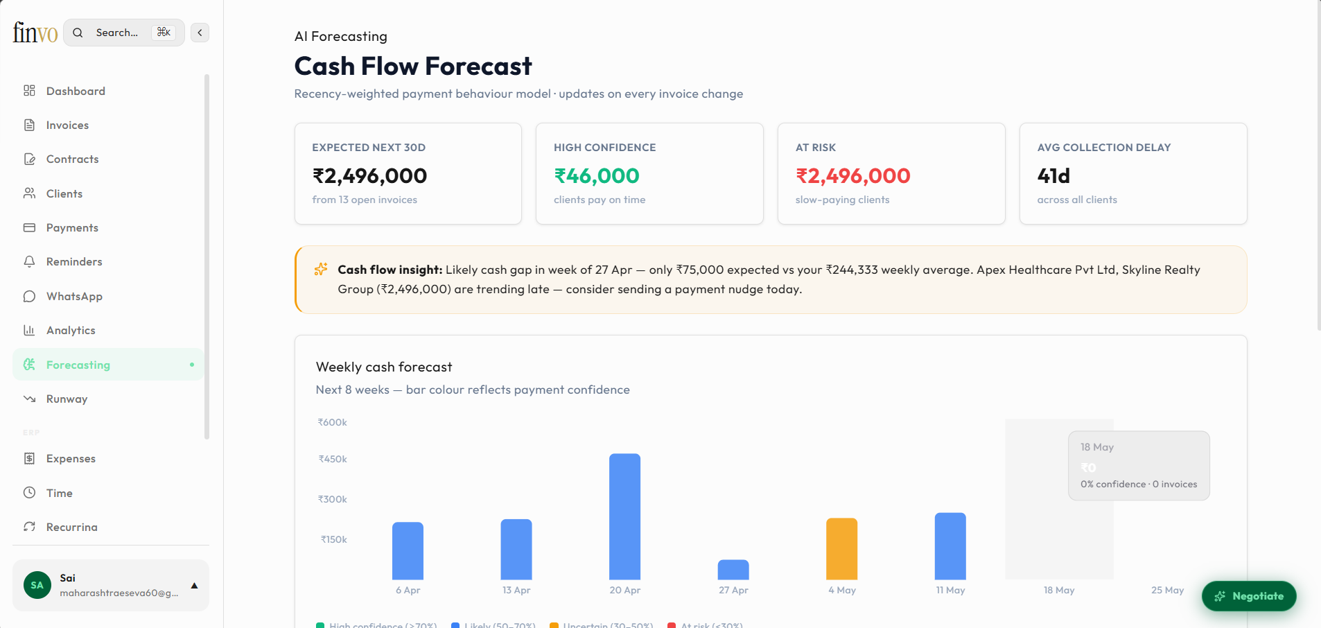 Finvo handles contract and milestone management with auto-invoice triggers, Razorpay inline payments, per-client cash flow forecasting using weighted payment behaviour models, and an AI negotiation assistant powered by the Anthropic Claude API that generates professional dispute responses in real time. Includes a white-labelled client self-service portal with magic link authentication, automated overdue reminders via EmailJS, client health scoring, a freelancer runway calculator, and GST-ready invoice generation.