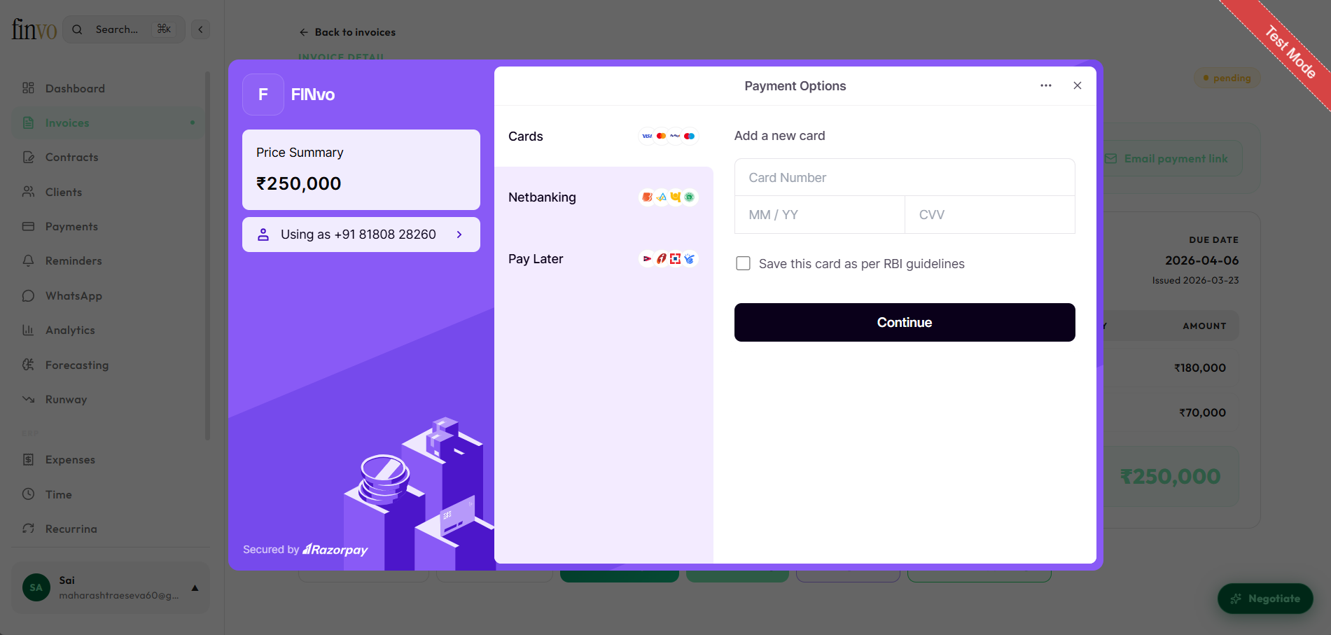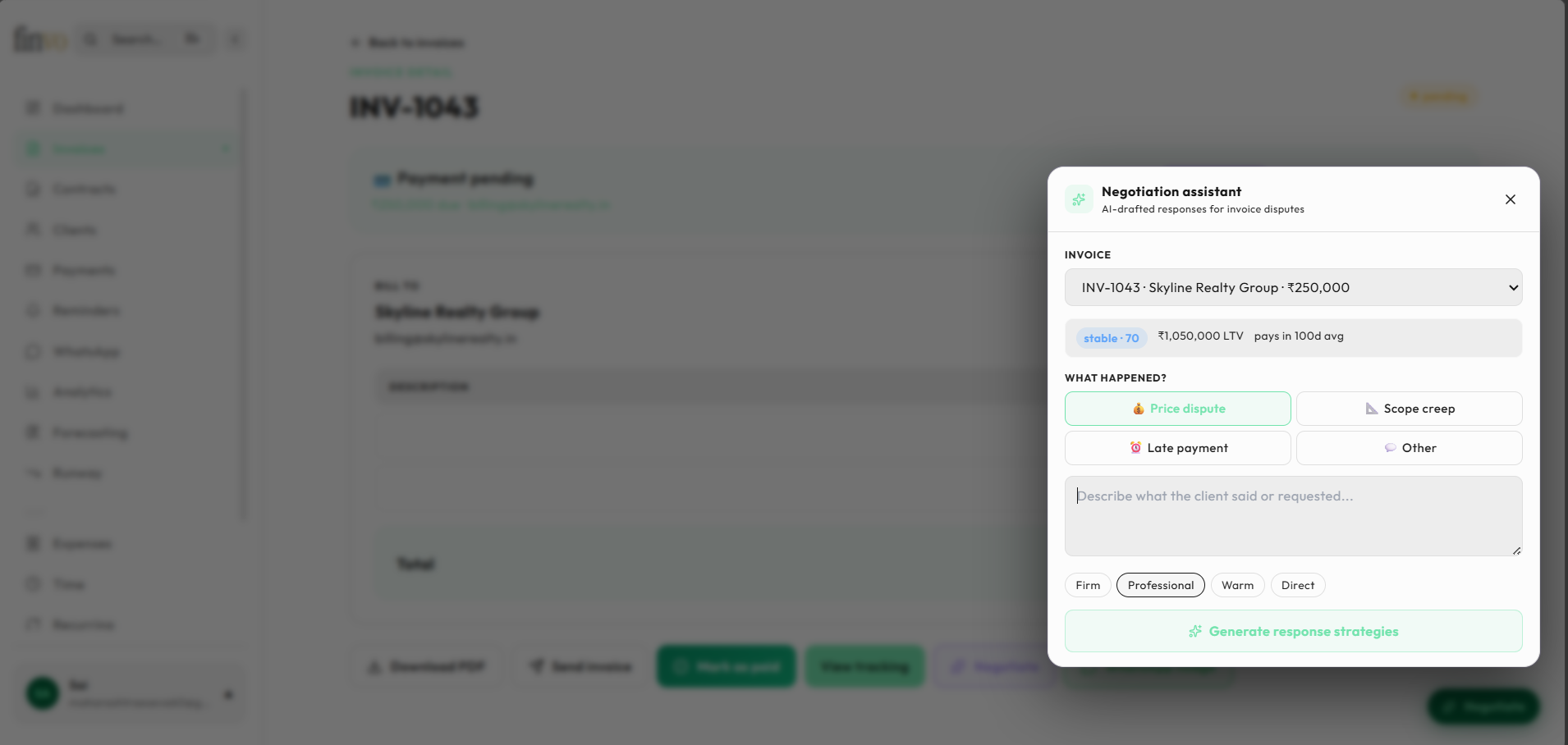 Finvo handles contract and milestone management with auto-invoice triggers, Razorpay inline payments, per-client cash flow forecasting using weighted payment behaviour models, and an AI negotiation assistant powered by the Anthropic Claude API that generates professional dispute responses in real time. Includes a white-labelled client self-service portal with magic link authentication, automated overdue reminders via EmailJS, client health scoring, a freelancer runway calculator, and GST-ready invoice generation.