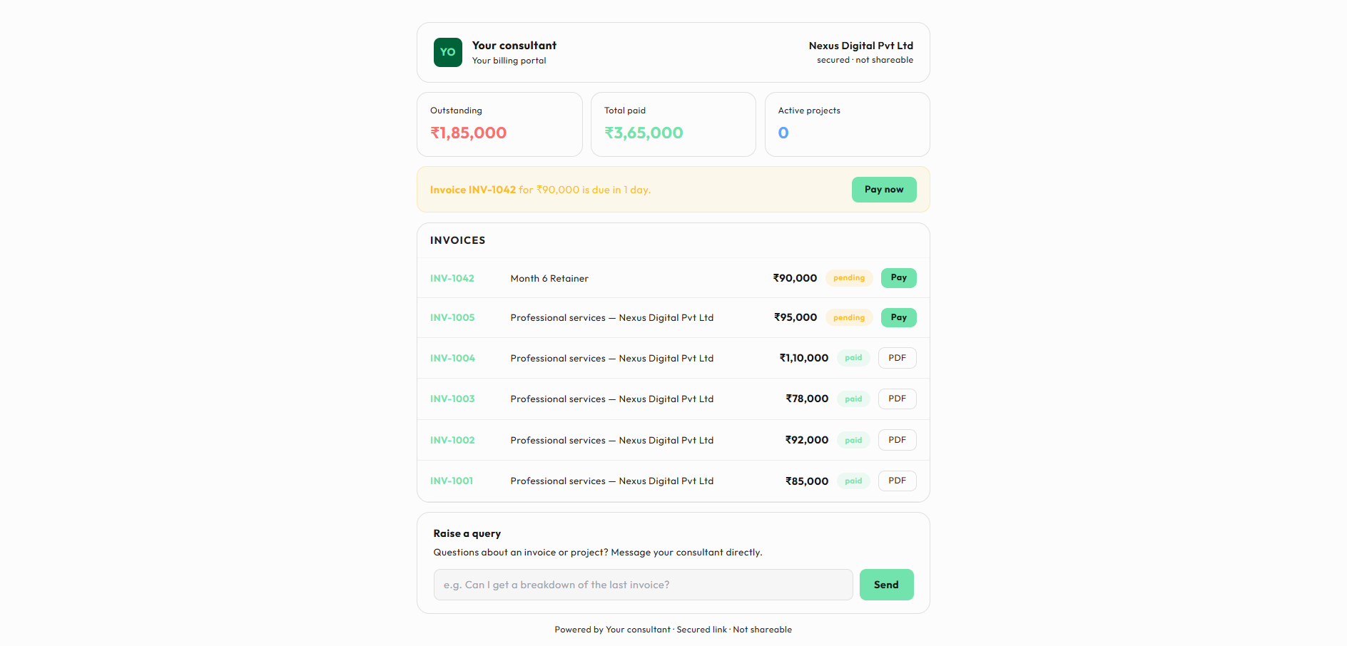 Milestone-triggered invoices with Razorpay inline payments. Clients pay without leaving the portal — no redirects, no friction.